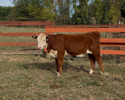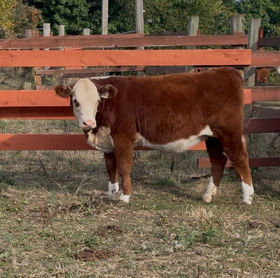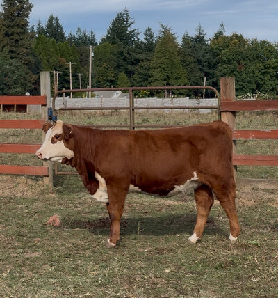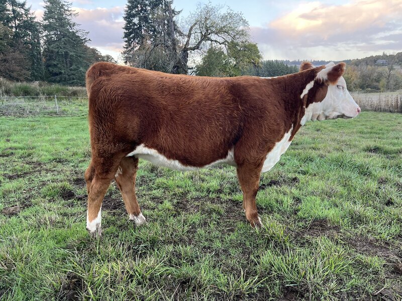 Oak is the result of 7 generations of bred and owned females on our farm, her bloodlines date all the way back to our very first Hereford heifer. She is naturally polled, has new age genetics, is moderately sized, and is extremely docile. Her grandmother is currently in our herd at 10 years old and still has a fantastic udder. Oak is her mother's (Honey's) first heifer calf, Honey raised a fantastic butcher steer last year that could have been a great 4-H market steer. Oak would make a fantastic youth show heifer or an excellent addition to any breeding herd.
