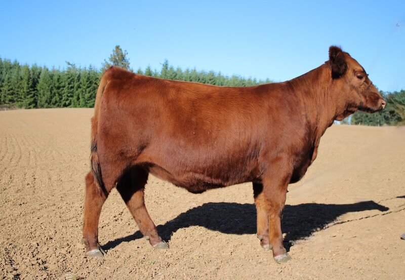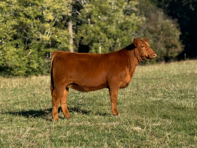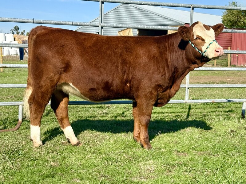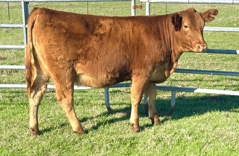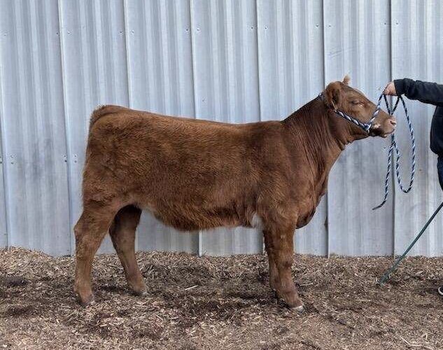 This February born Red Purebred Simmental heifer is sired by GLS Declaration and backed by a Bankroll x Bar CK 8047 dam. She is feminine fronted, halter broke, and gentle natured. With a diverse pedigree and a standout look, she would be a great fit for juniors as well as any cattle breeder.
