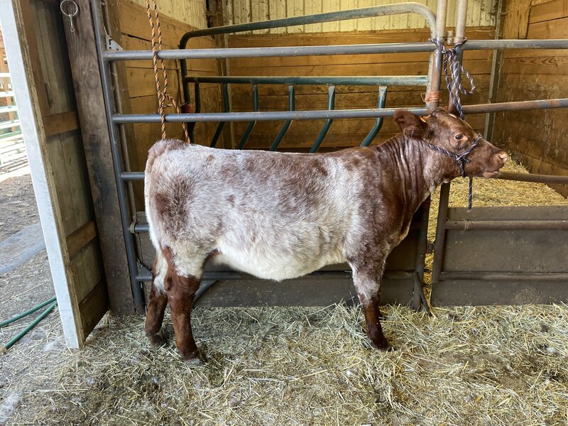 Don’t sleep on this heifer just because she’s a touch green- fresh off the mountain, first time being clipped on and haltered and she’s an absolute doll. Her mother is a cow that never missed and we’ve retained another half sib of hers that hits the nail on the head with her calves every year. Maternal, deep bodied, and flashy. Show her this year and then put her in your breeding pen. Docile enough for a first year showman and competitive enough for the show string.